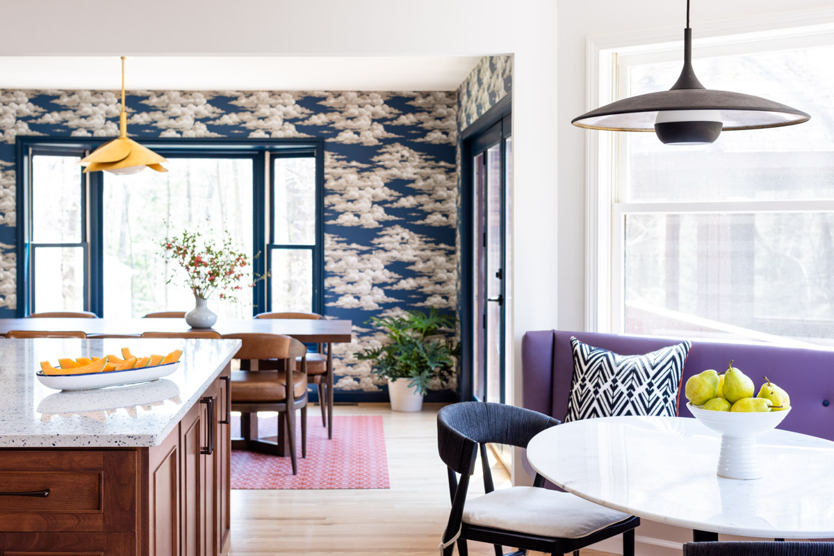 Full kitchen renovation and redesign of first floor interiors, including living room fireplace.
